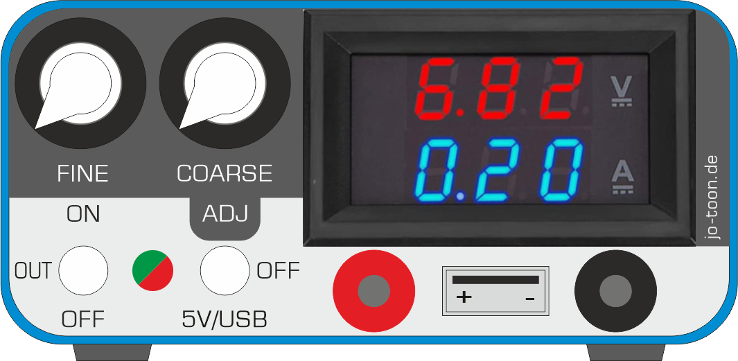 Grobjustage der Spannung, Ausgang einstellbar (ADJ), Gerät OFF oder fix (5V/USB)