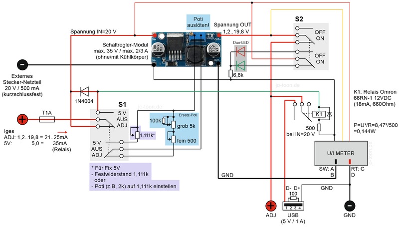 - Wechselschalter S1 2xUM mit Mittelstellung OFF zur Umschaltung ADJ|OFF|5V/USB